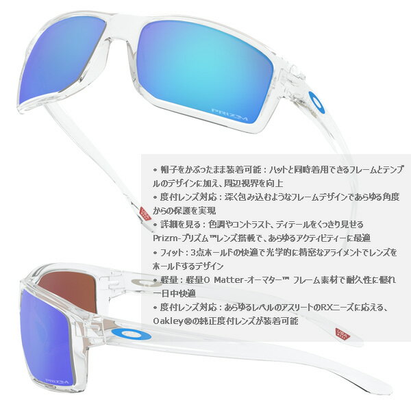 ●BRAND :OAKLEY(オークリー) ●品 番:OO9449-0460 ●品 名:GIBSTON ●フレーム :Polished Clear ●レンズ :Prizm Sapphire Light Transmission : 12% Light Conditions : 明るい光 Contrast : 増加しました ベースレンズカラー : 青色 ●フィッティング:Standard ●付属アイテム : Microbag Large-Black 【レンズ PRIZM】: Prizmは、色彩科学研究の数十年に構築された レンズ光学における革命である。